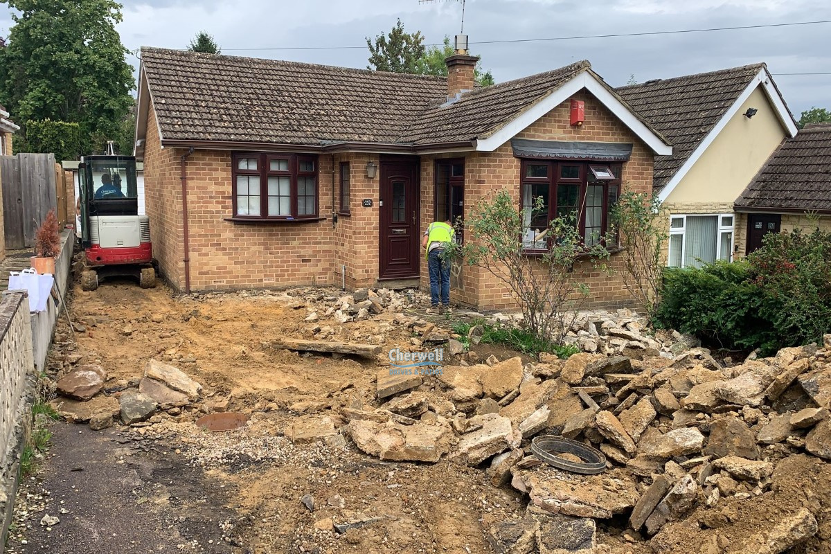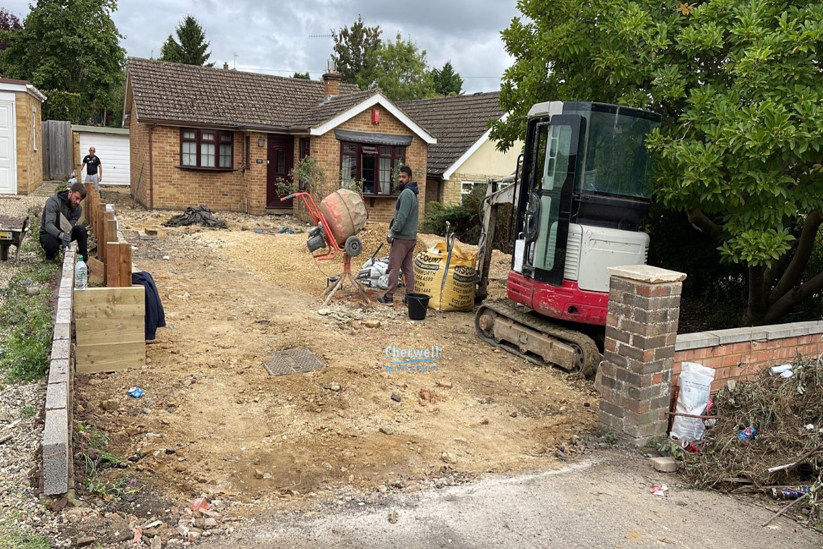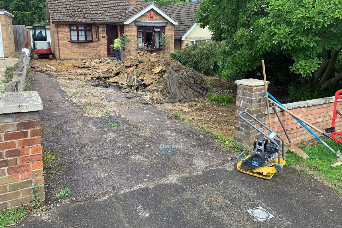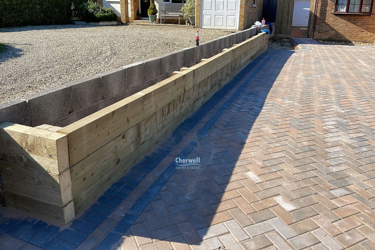 This project has been supplied and installed by Cherwell Drives and Patios in Banbury. We removed the original driveway and put in a new hardcore foundation. Then we built a new wall between the neighbours and raised flowerbeds with railway sleepers. We laid the driveway with block paving in a 45° pattern, respecting the curves and shapes of the existing greenery. We gave the driveway a double and single charcoal border with an interesting pattern at the entrance.
