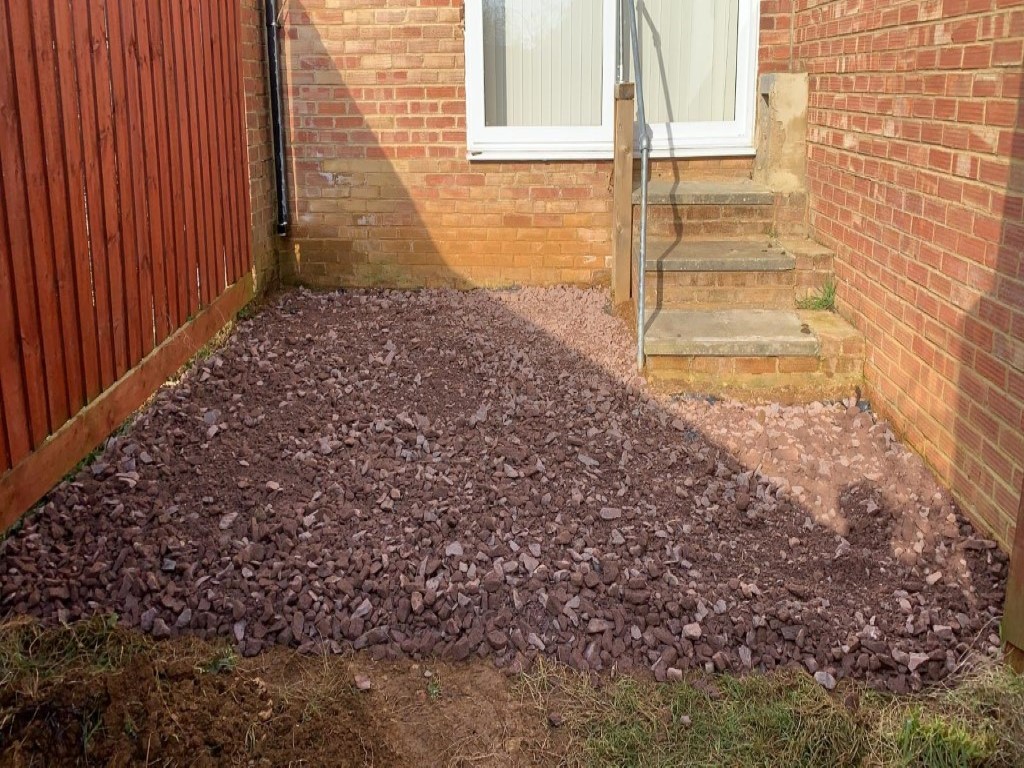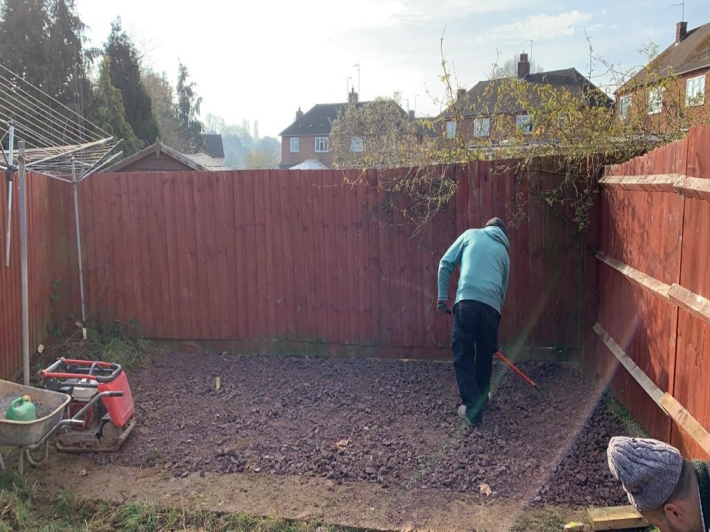 We started by removing the old surface, which included old concrete, block paving and lawn. Then we leveled the area and started laying our foundation. We used an 804 stone base as well as a heavy duty membrane, to prevent any unwanted weed growth.
