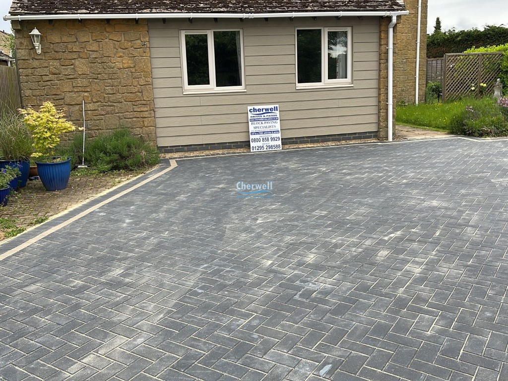 These photos showcase a driveway transformation supplied and installed by Cherwell Drives and Patios in Banbury. We removed the original surface and installed a new hardcore foundation with a weed control membrane. We laid the driveway with charcoal block paving in a 45° pattern and inserted a natural grey pinstripe around the perimeter. We installed a colour-matching apron in a staggered stretcher bond pattern at the entrance for a slightly different look.