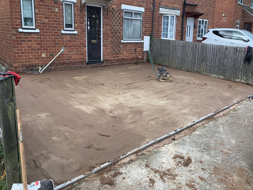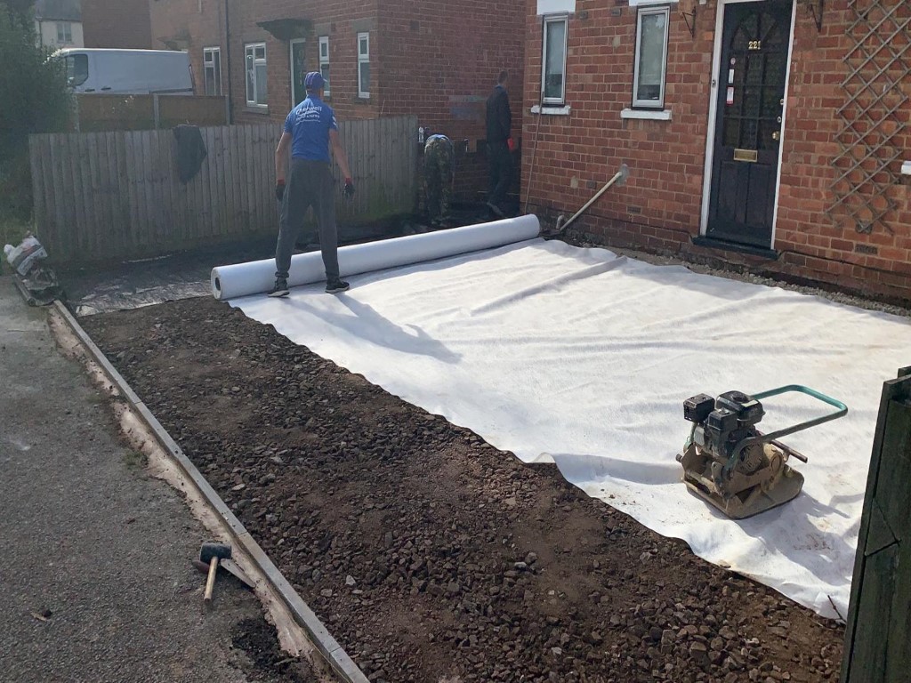 Then we laid new membrane sheeting with hardcore type 1 MOT base on top. We applied a bed of sand and screeded it down.
