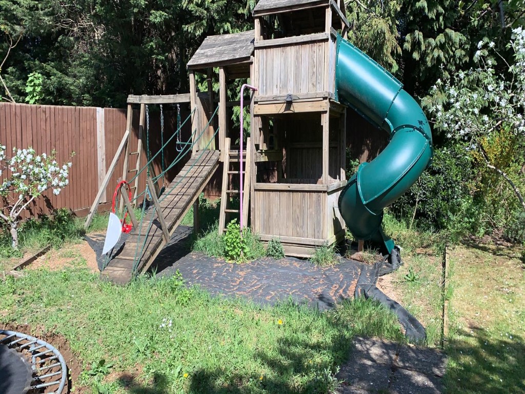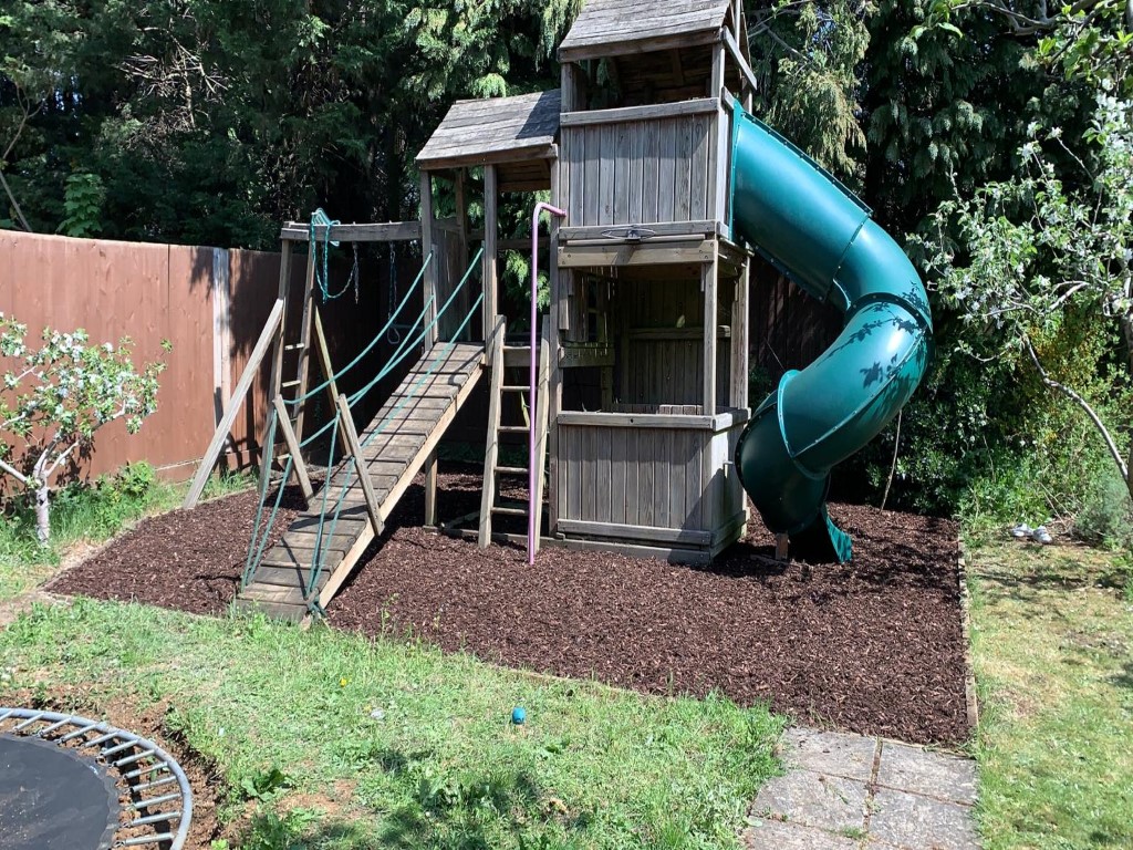 First we dug out the area around the playhouse. We used the existing kerbing, and laid a weed protective membrane following this outline. This will prevent weed growth from sprouting in here. We topped it with a thick layer of decorative bark, that is pleasing to the eye and softens the footsteps of running children.