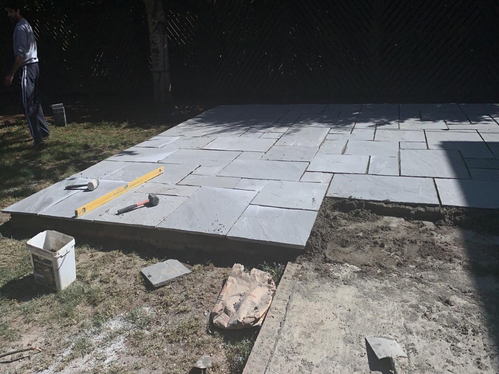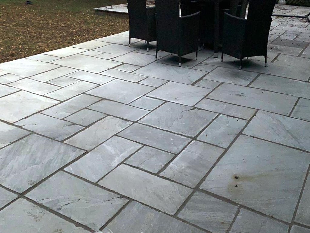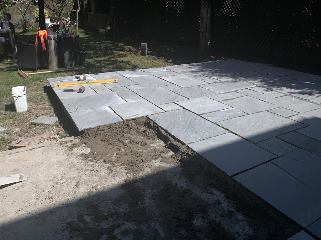Next step was to install the new patio. Once again we started by clearing the area and laying down a new hardcore foundation, this time with a concrete base. We laid the patio with Grey Indian Sandstone slabs in various sizes for an irregular, eye catching look. Once finished, the whole area was grouted for extra durability.