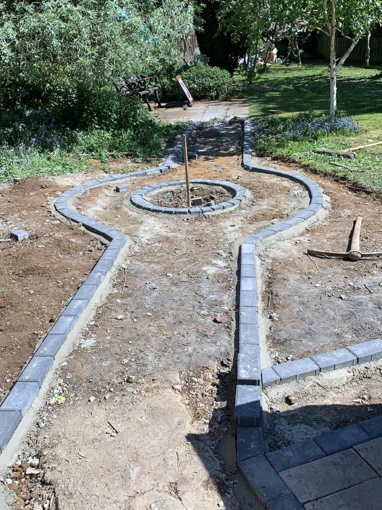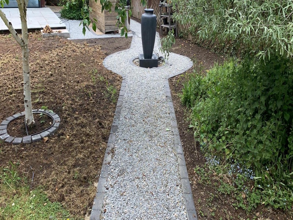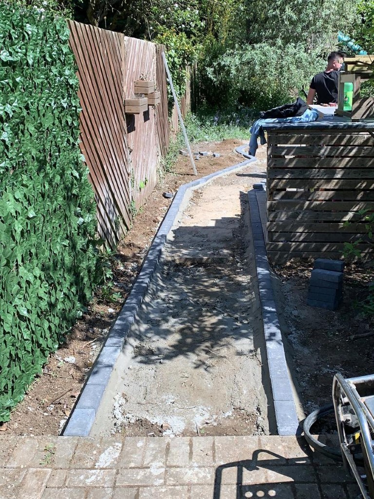 Then we dug out the area for the footpath and laid a new foundation down. We set the paved edgings in concrete, so they will not move anywhere over time. As a centerpiece, we installed new beautiful fountain in the middle of the footpath. Having a little water oasis in the middle of the city, attracts birds, butterflies and other pollinators, that are crucial for our environment.