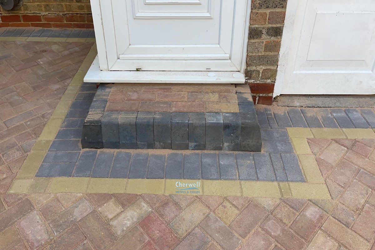 We extended the layout on both sides for more comfortable parking and defined the driveway with concrete flat-top kerbing. We laid the driveway in a 45° pattern with brindle bricks and enclosed it with buff and charcoal borders. We also built a matching doorstep.