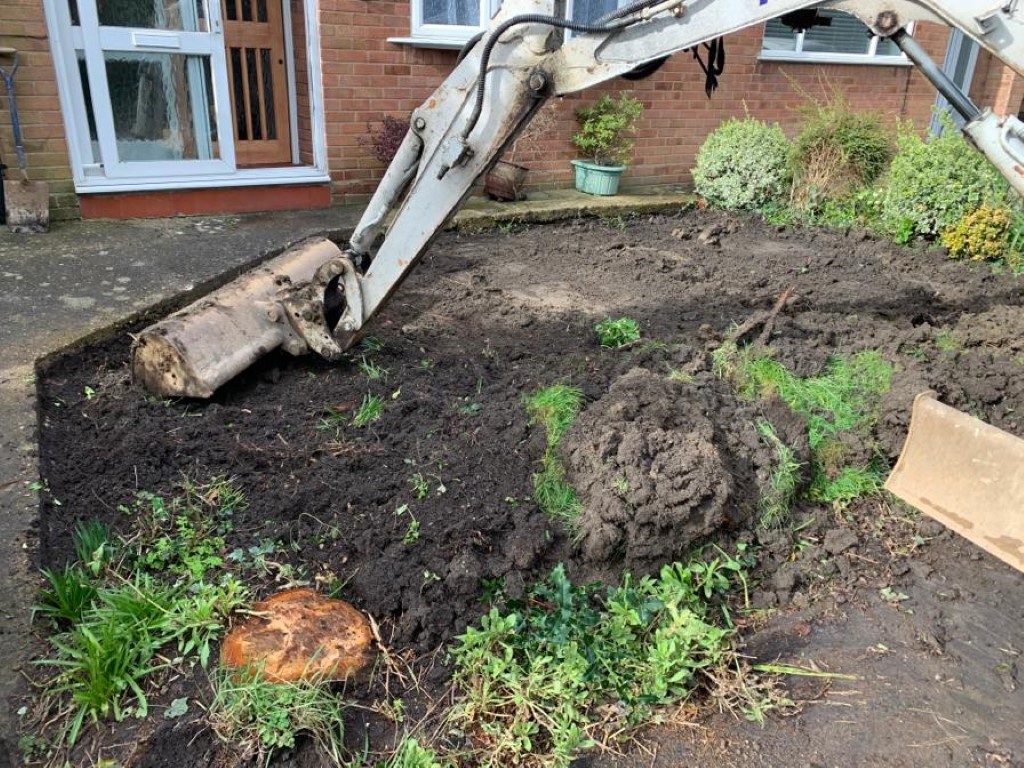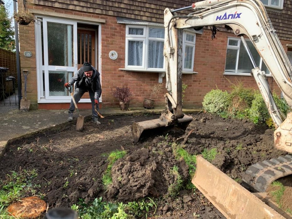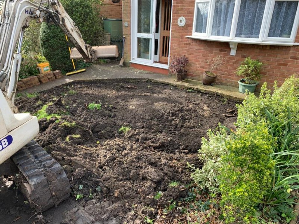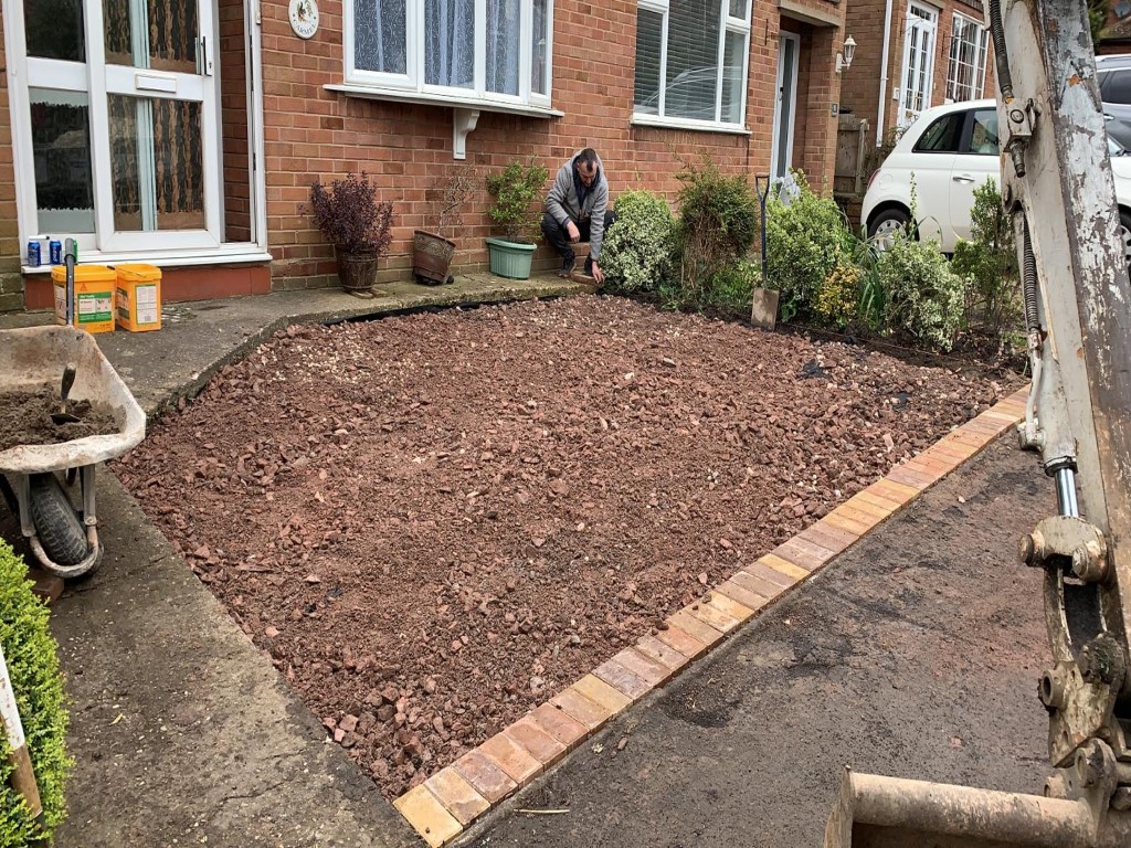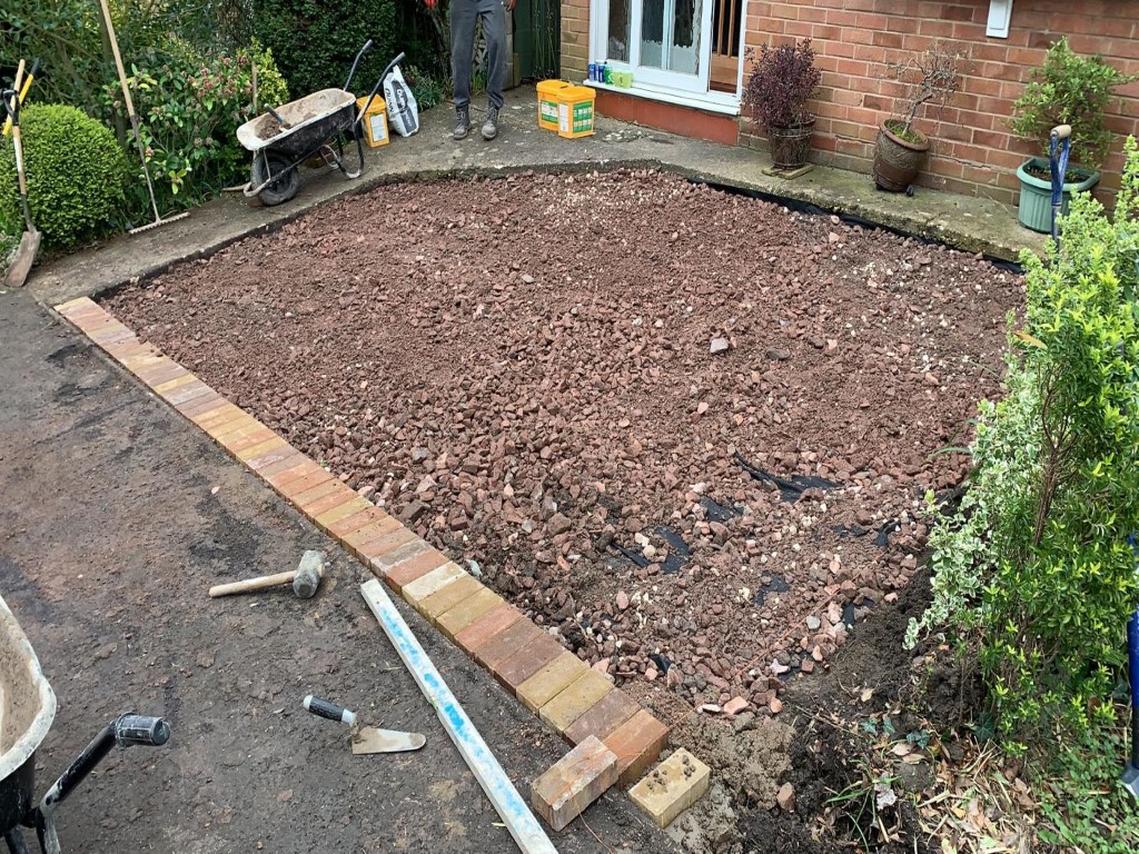 First we dug out the existing lawn, removed all shrubs in the area and old trees. Then we laid down a new hardcore base with heavy duty membrane sheeting.