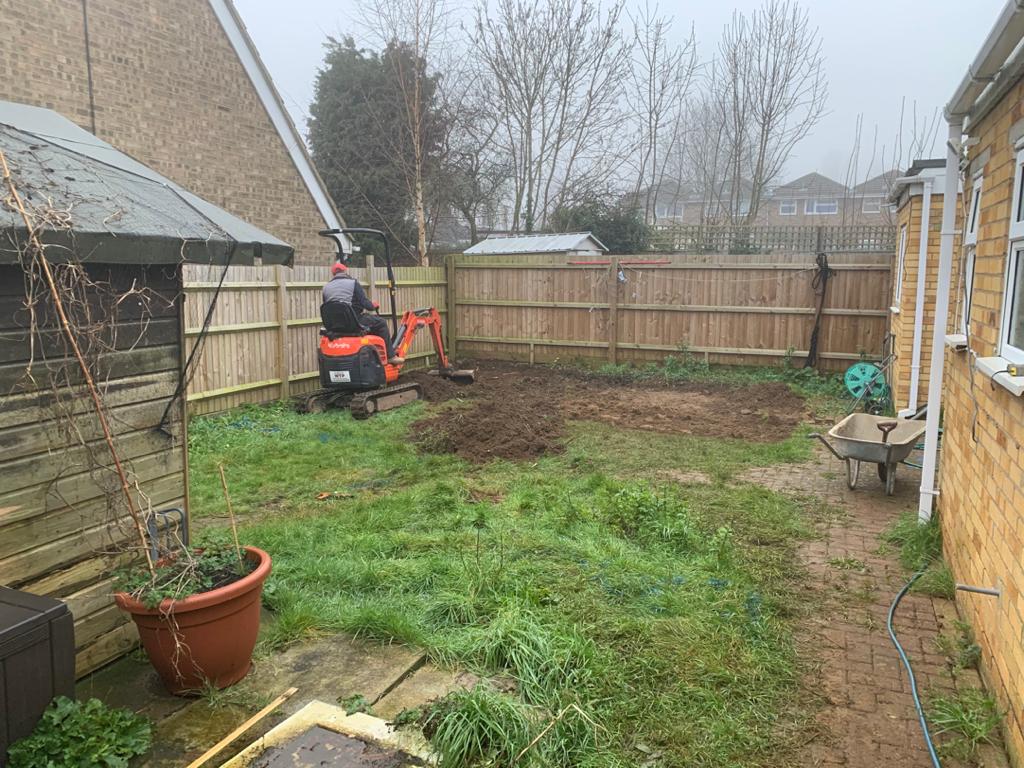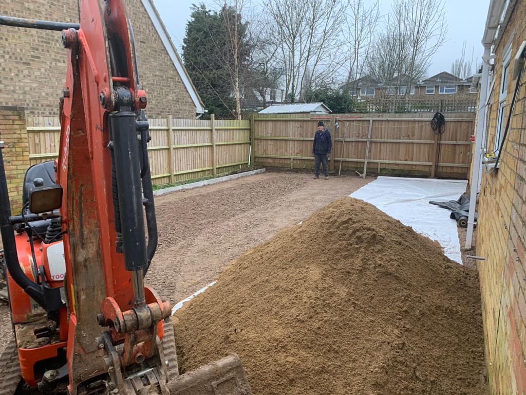We compacted the ground to get it nice and flat, laid down a hardcore membrane sheeting and topped it with a bed of sand and cement mix to put the slabs on.