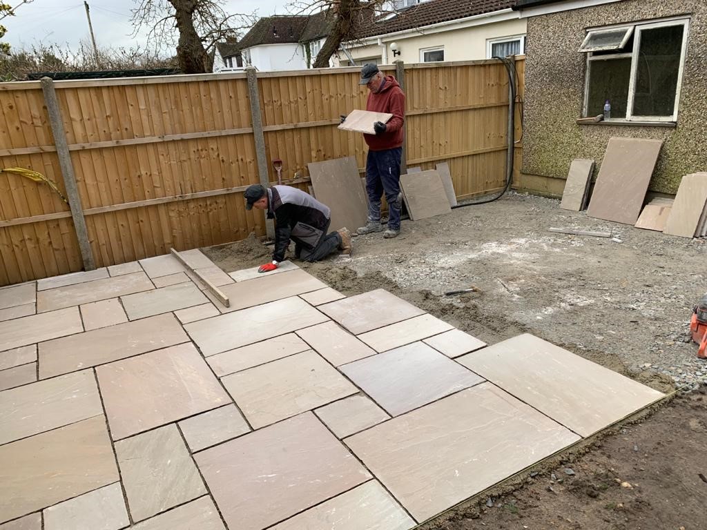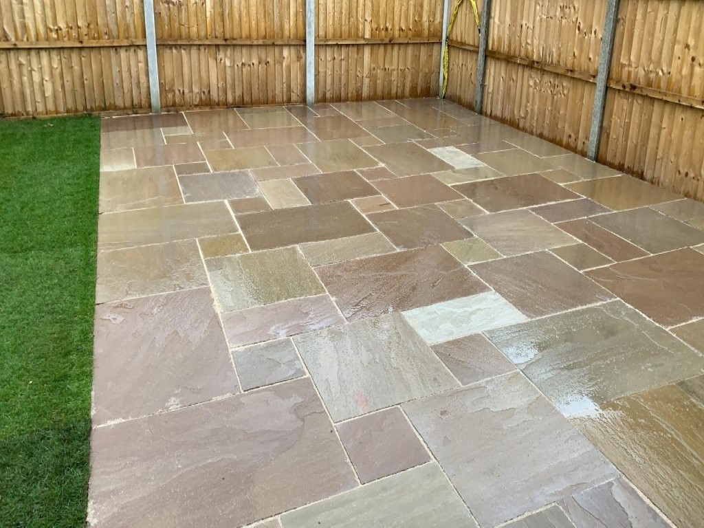 We laid the Indian Sandstone patio slabs on a bed of concrete for extra sturdiness and grouted all the gaps for a nice clean look.