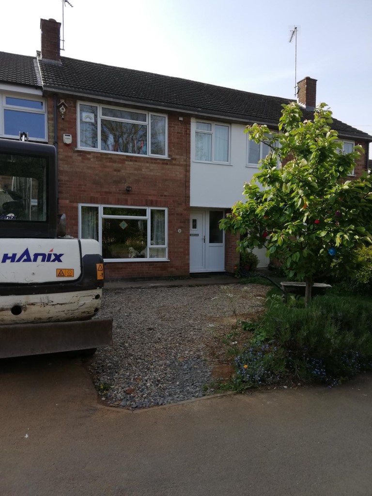 First we took out the original gravel and tarmac driveway and the lawn area. Then we put down a new base of hardcore stone on top of a heavy duty membrane sheeting.