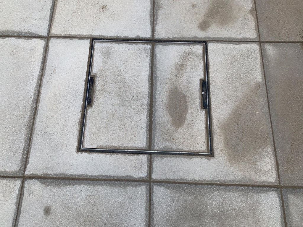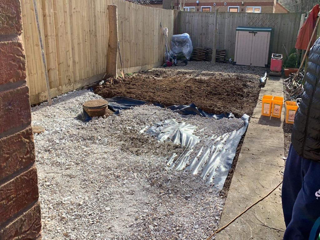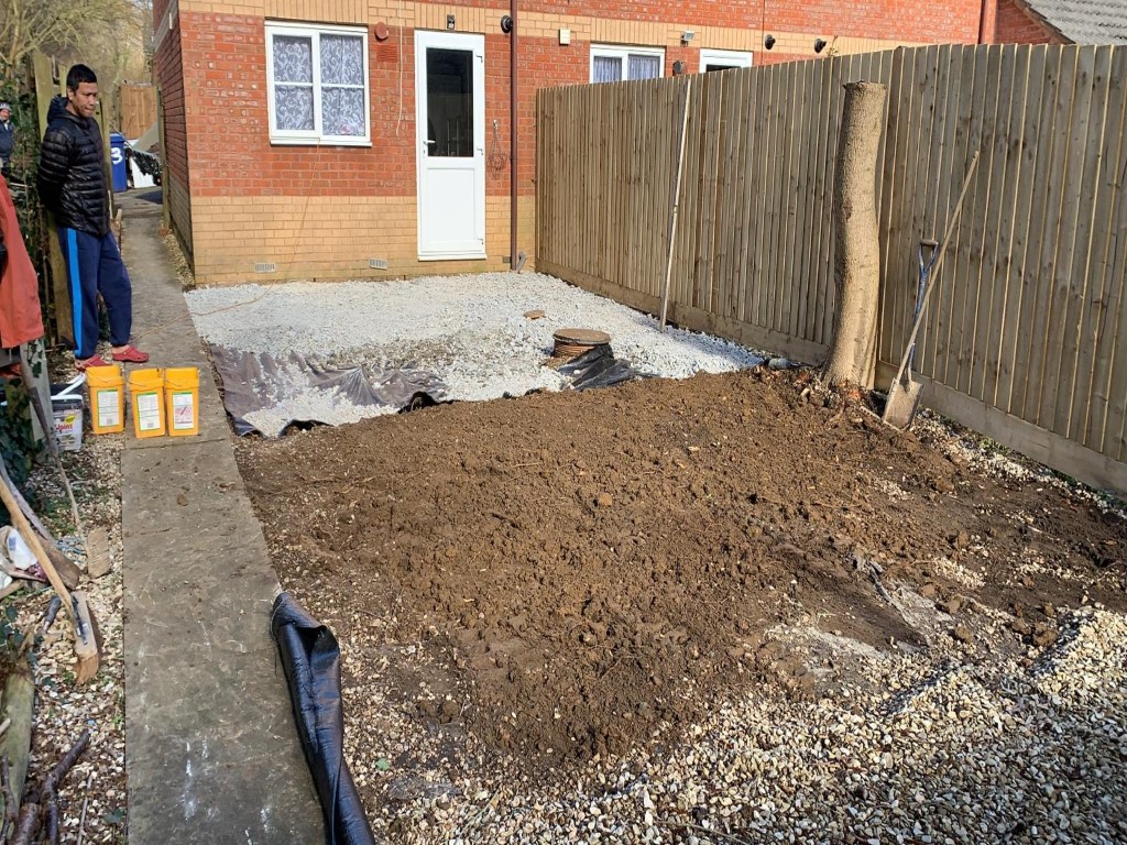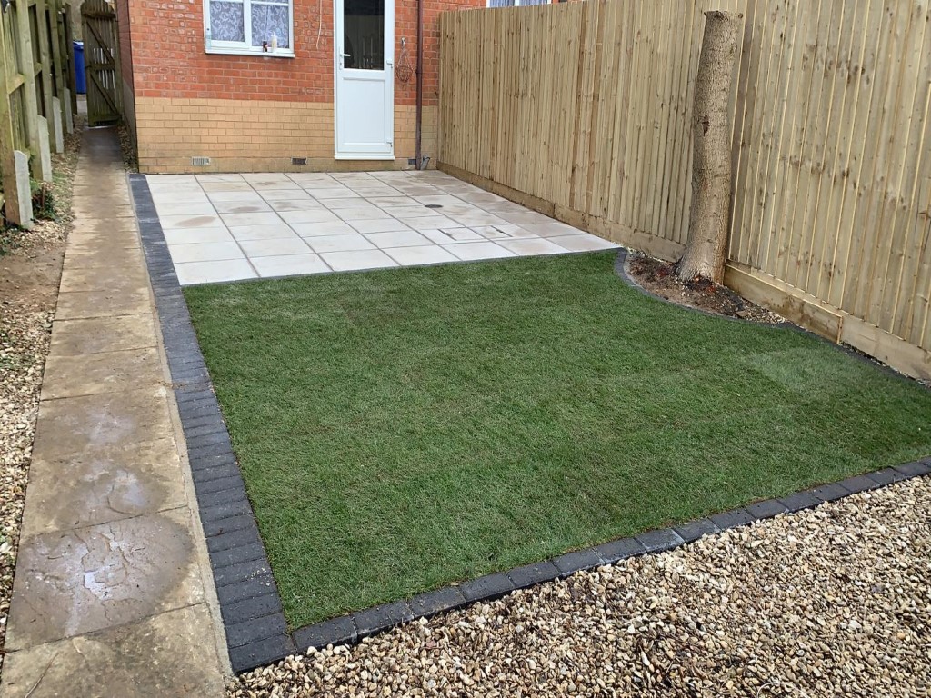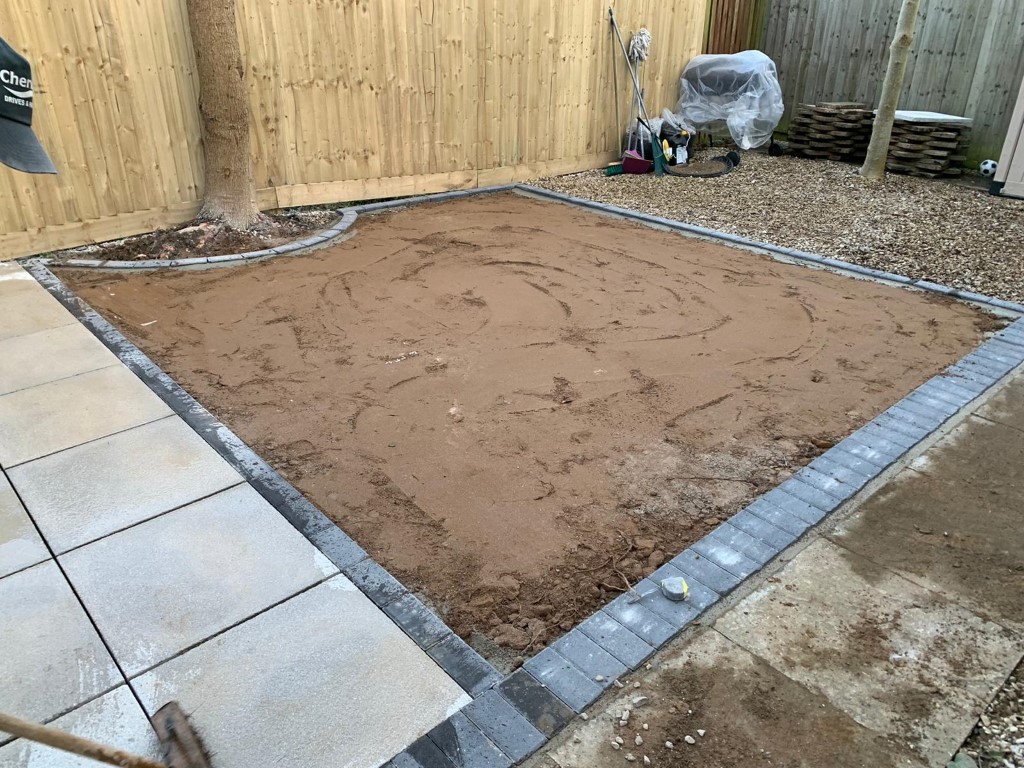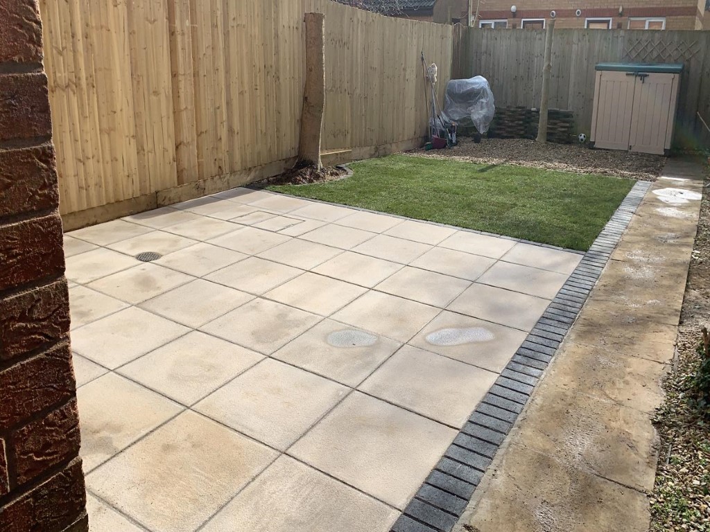 We put in a new hardcore base as well as a weed protective membrane. Then we put down a new slabbed patio with charcoal paving blocks as a border. We seamlessly included a drain and a manhole cover in the surface.