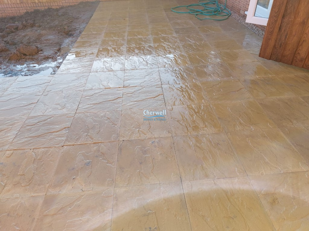 First, we have ripped the original surface and installed a new foundation with a redesigned layout. We installed the patio with 450 by 450 mm buff riven slabs. Cherwell Drives and Patios have completed this transformation in Shipston-on-Stour.