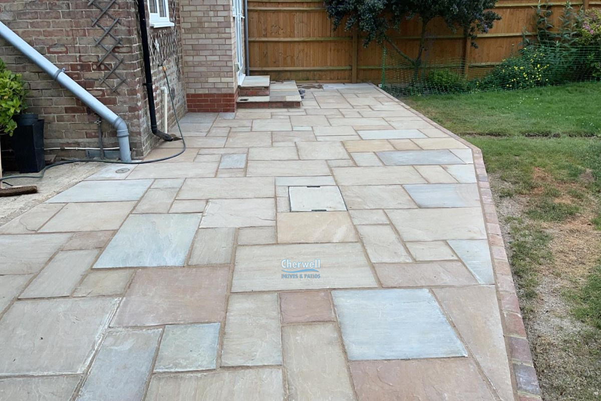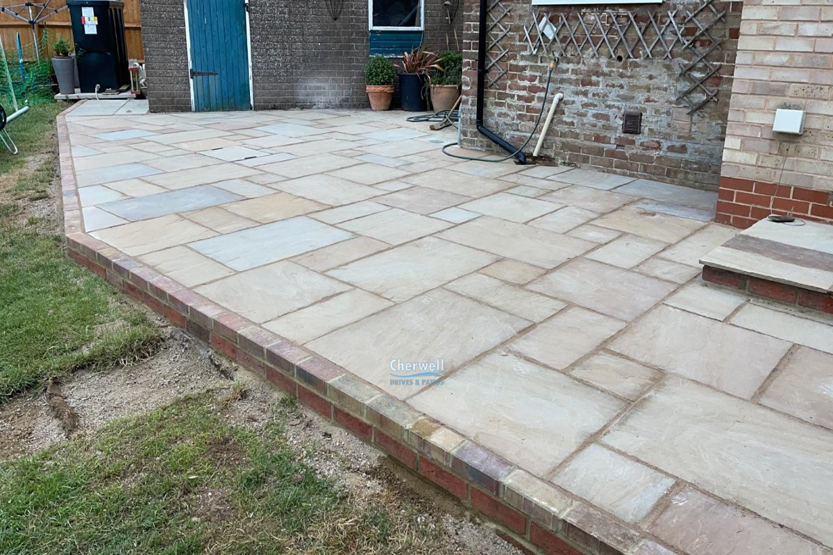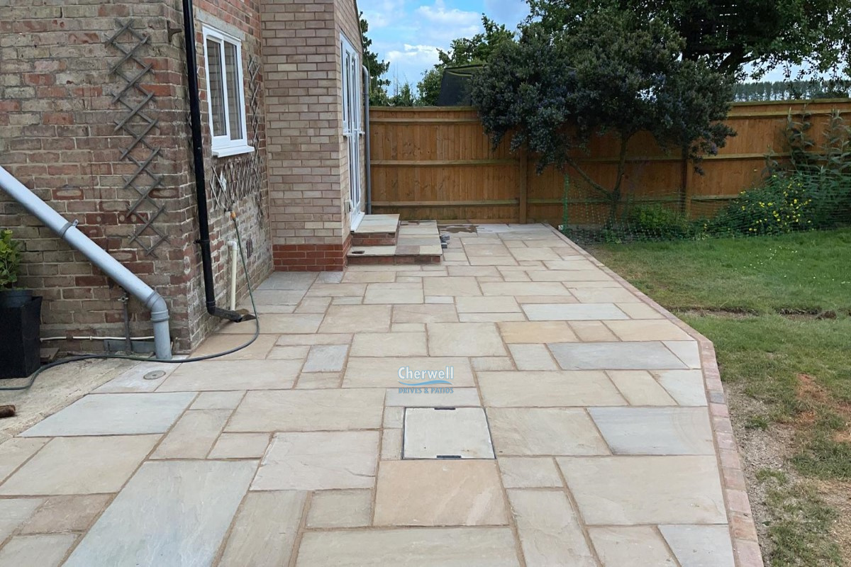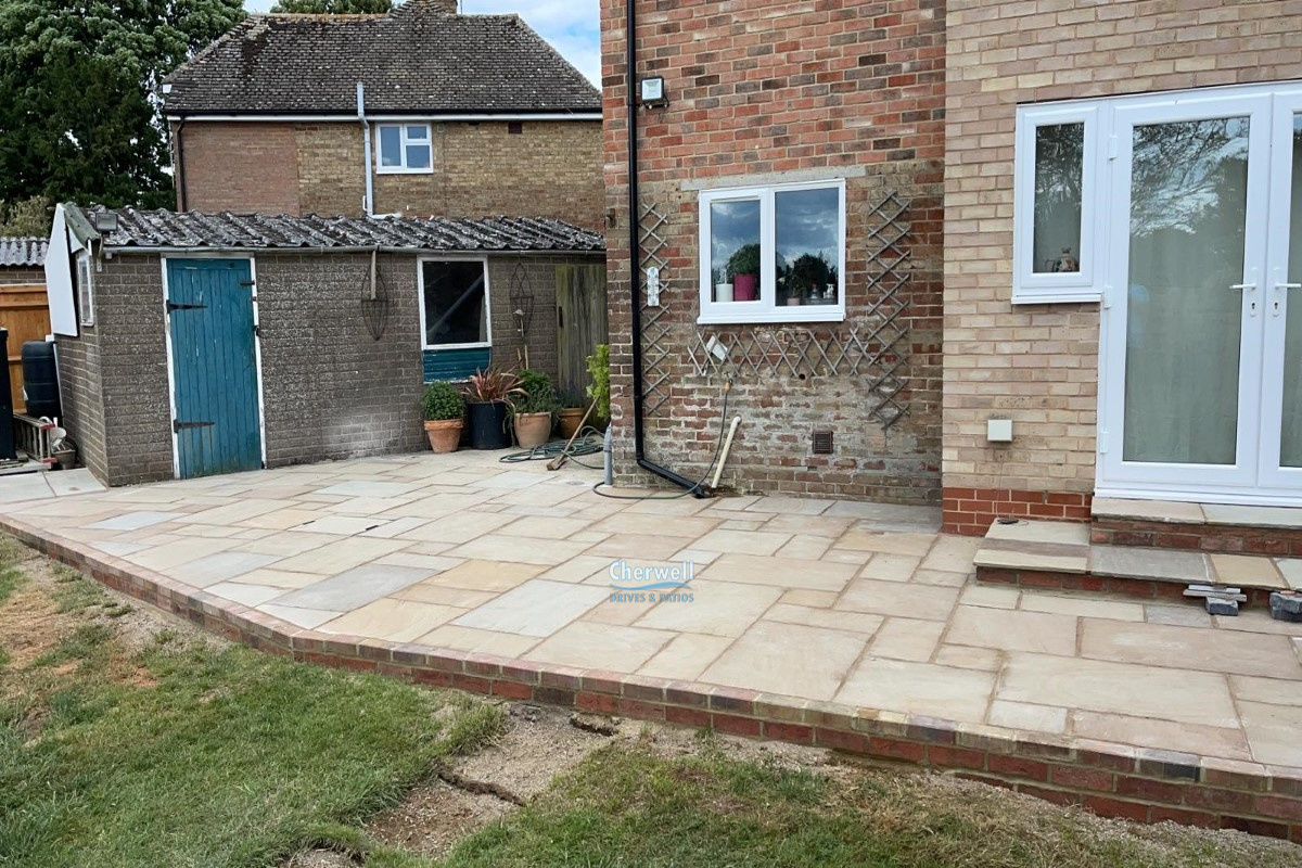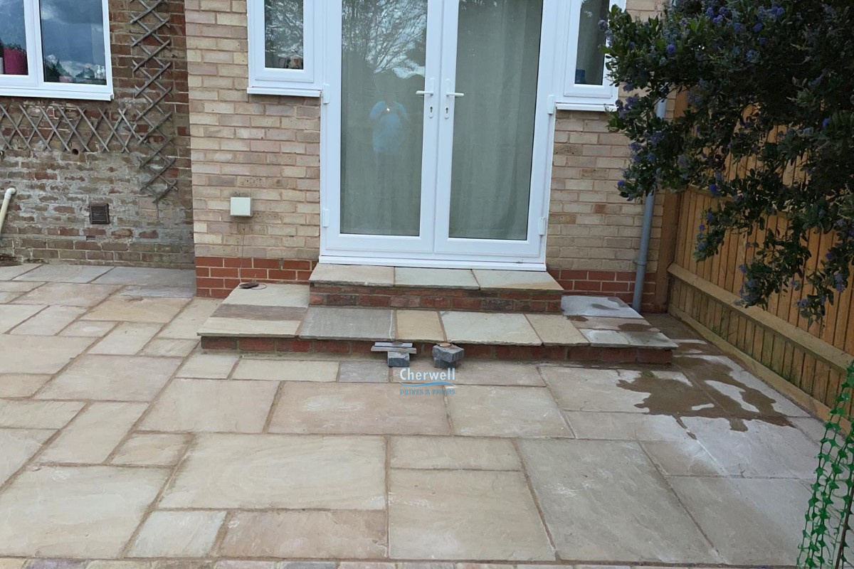 This project has been completed by Cherwell Drives and Patios in Banbury, and it features Indian sandstone slabs on a raised platform with brick retainers and a matching double doorstep.