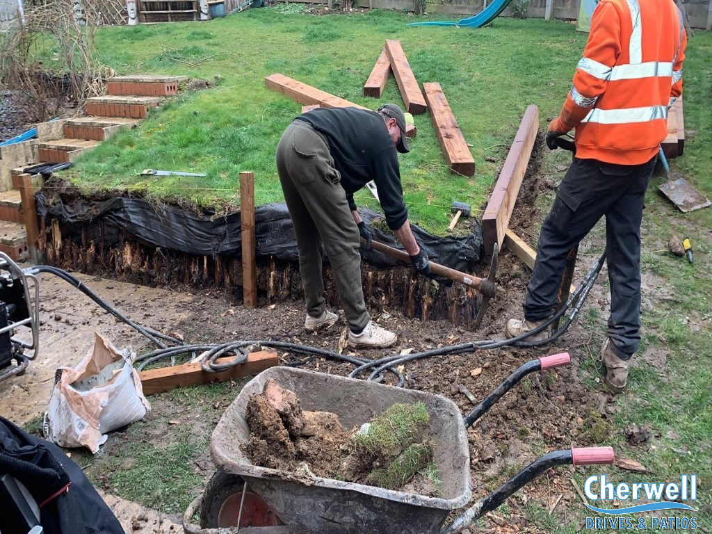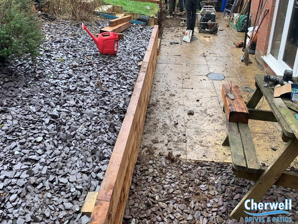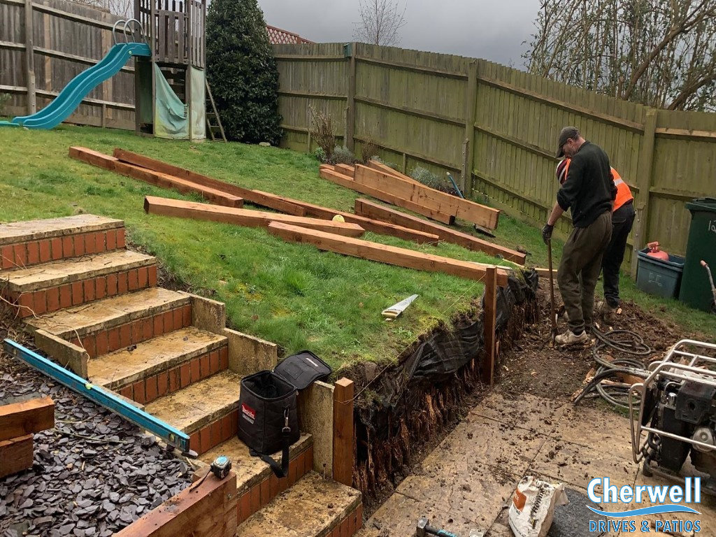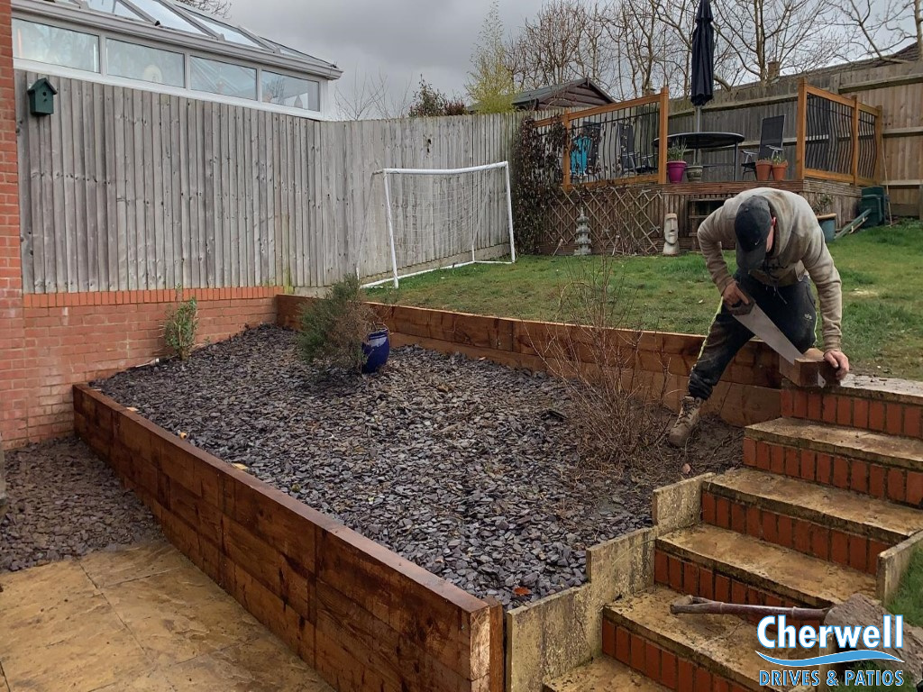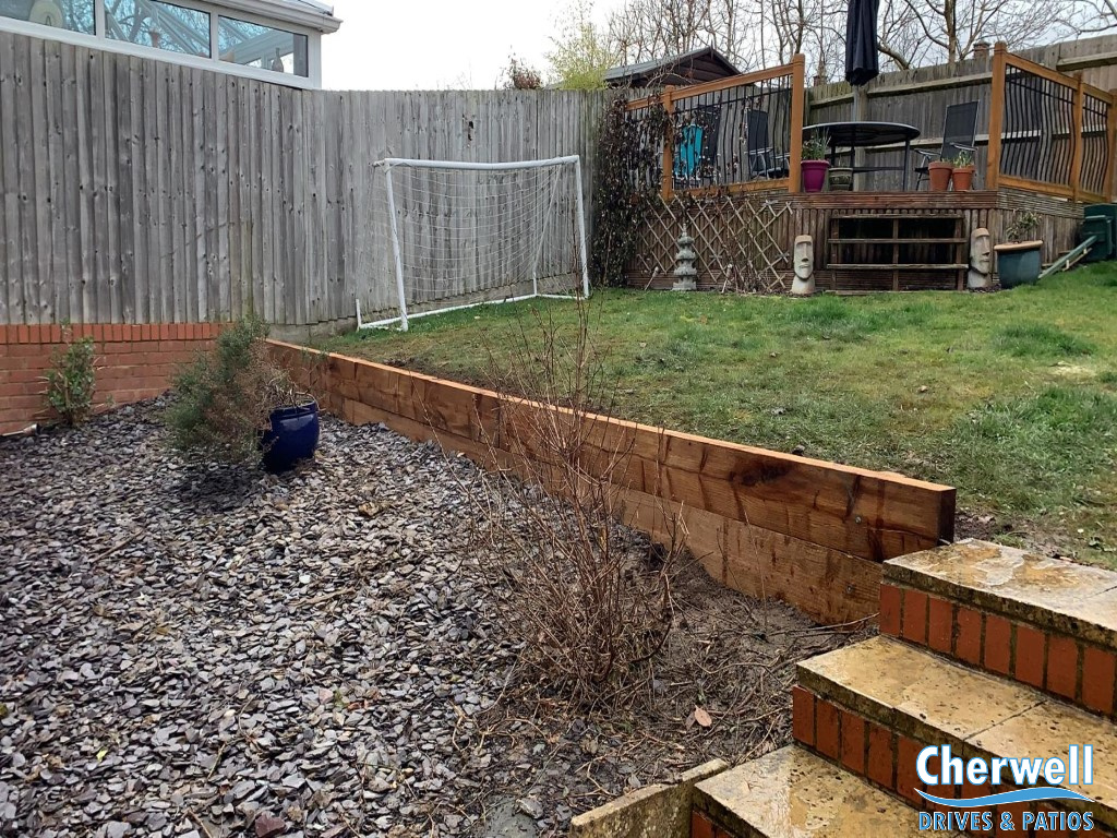 In this job in Banbury we have completely replaced old, rotten retaining walls with beautiful new treated railway sleeper walls.