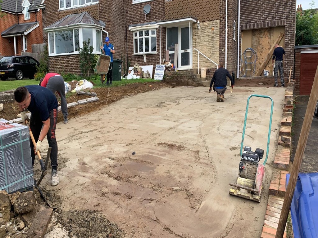 We dug out the original driveway and grass first. Then we leveled the area off, so the sloping would be even all over. We installed new membrane and hardcore type 1 MOT base and compacted them down.