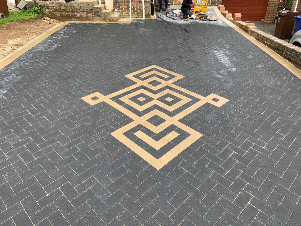 Then we laid the driveway with Charcoal paving blocks for the main layout and Buff paving blocks for the border and the pattern in the centre.