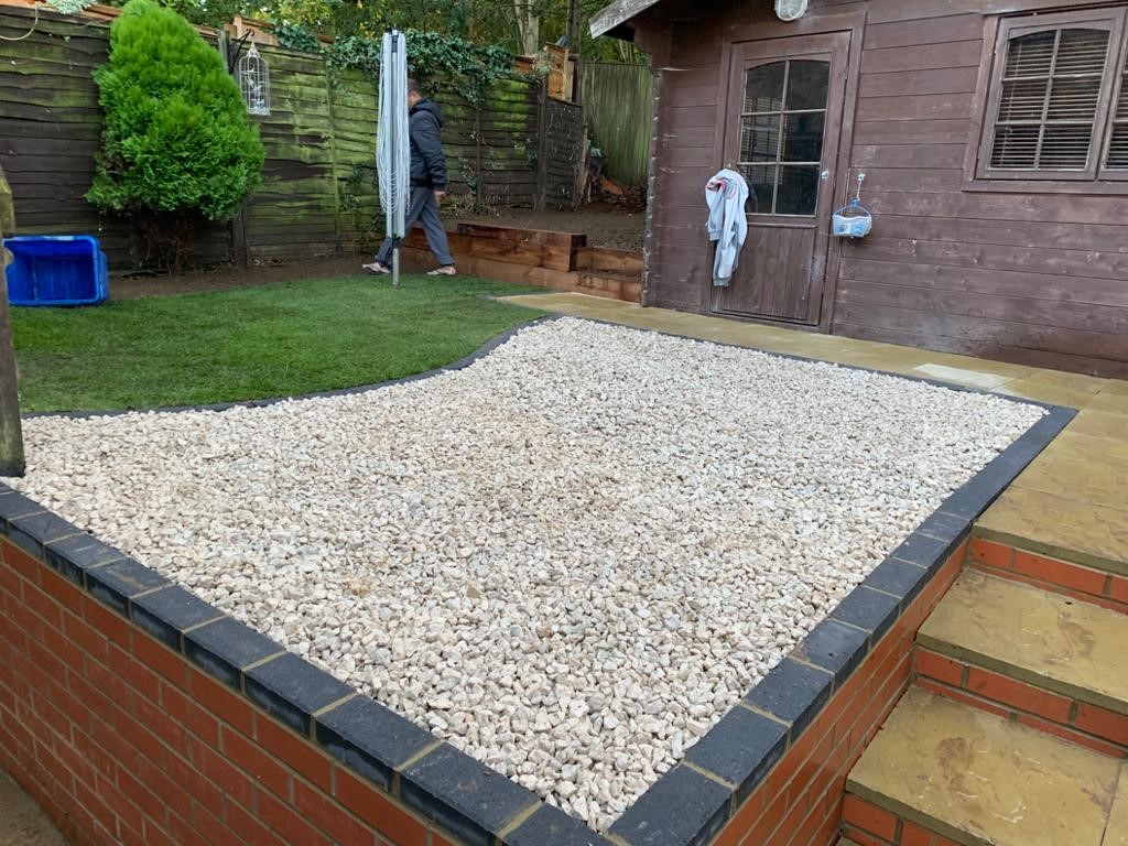 We took out the old, damaged decking and installed a retaining brick wall to reinforce the area. On top we laid the usual groundwork for any project – new solid base and protective membrane. The team filled one half of the area with gravel, the other with new turf for a spot of greenery.