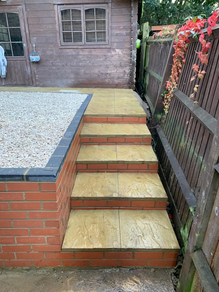 We also built new steps coming down onto the patio. We used red bricks, matching the retaining wall, and square Indian Sandstone slabs.