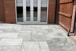 This project has been completed by Cherwell Drives and Patios in Banbury, and it features Indian sandstone slabs on a