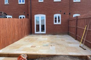Cherwell Drives and Patios installed a new extended patio in Brackley, featuring Indian sandstone slabs with railway sleeper retainers, one