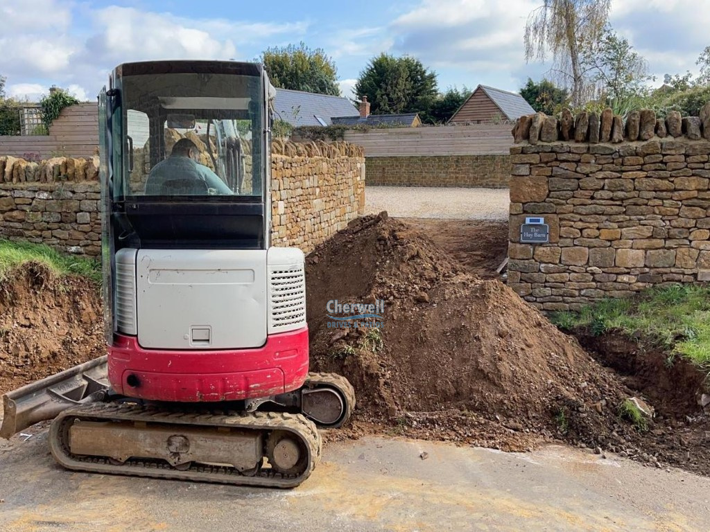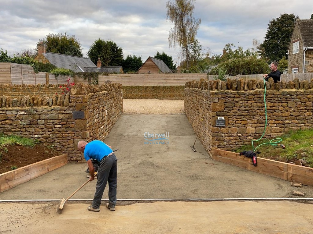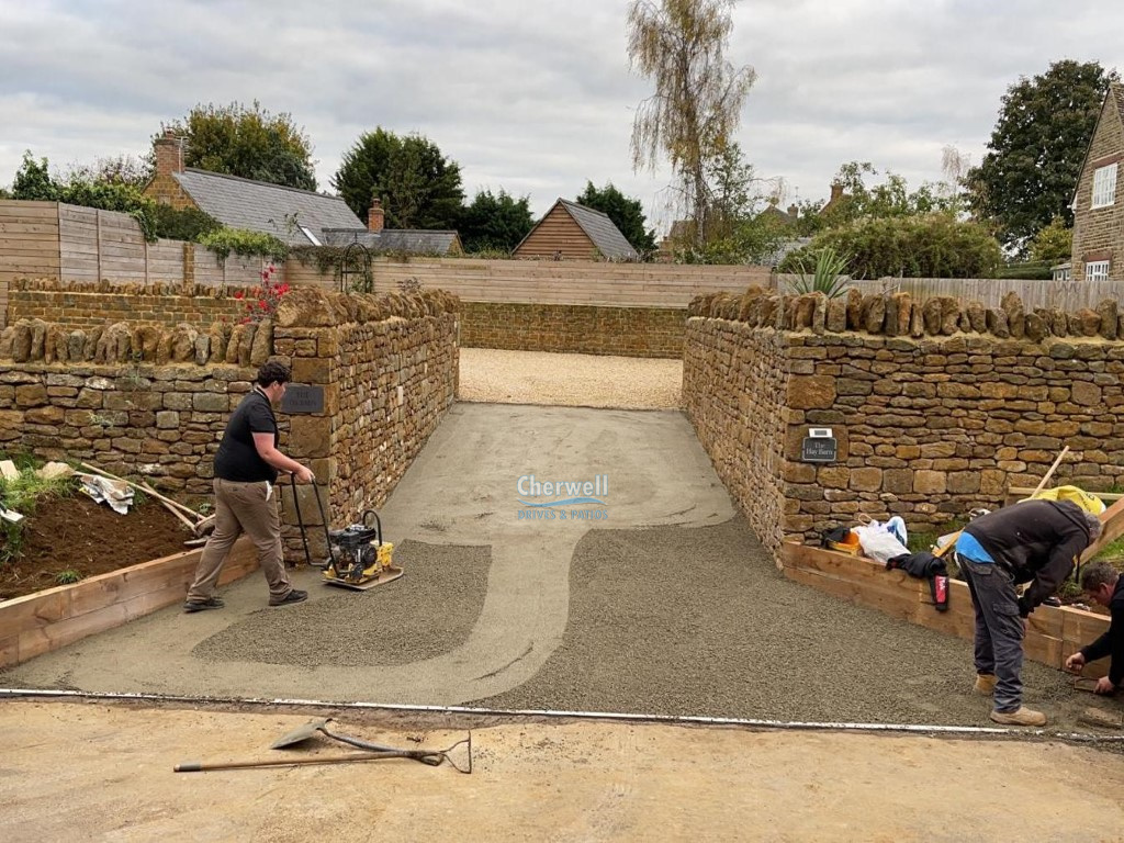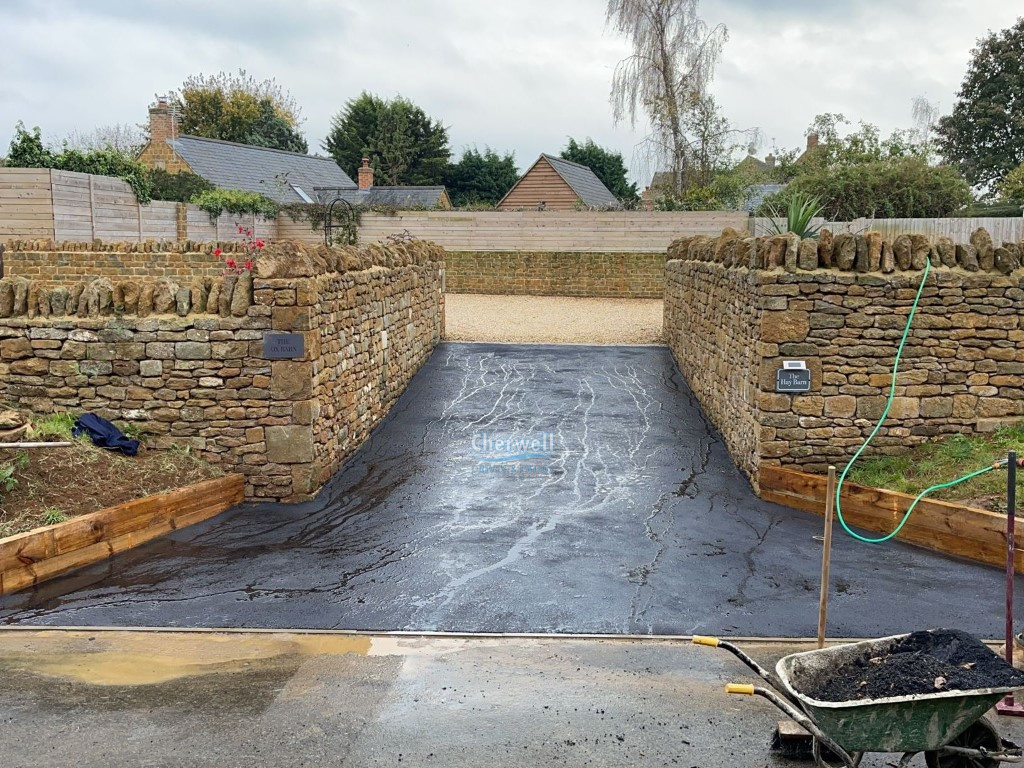 New tarmac driveway has been installed on new hardcore foundation with treated railway sleepers for retaining walls on either side by Cherwell Drives and Patios in Banbury.