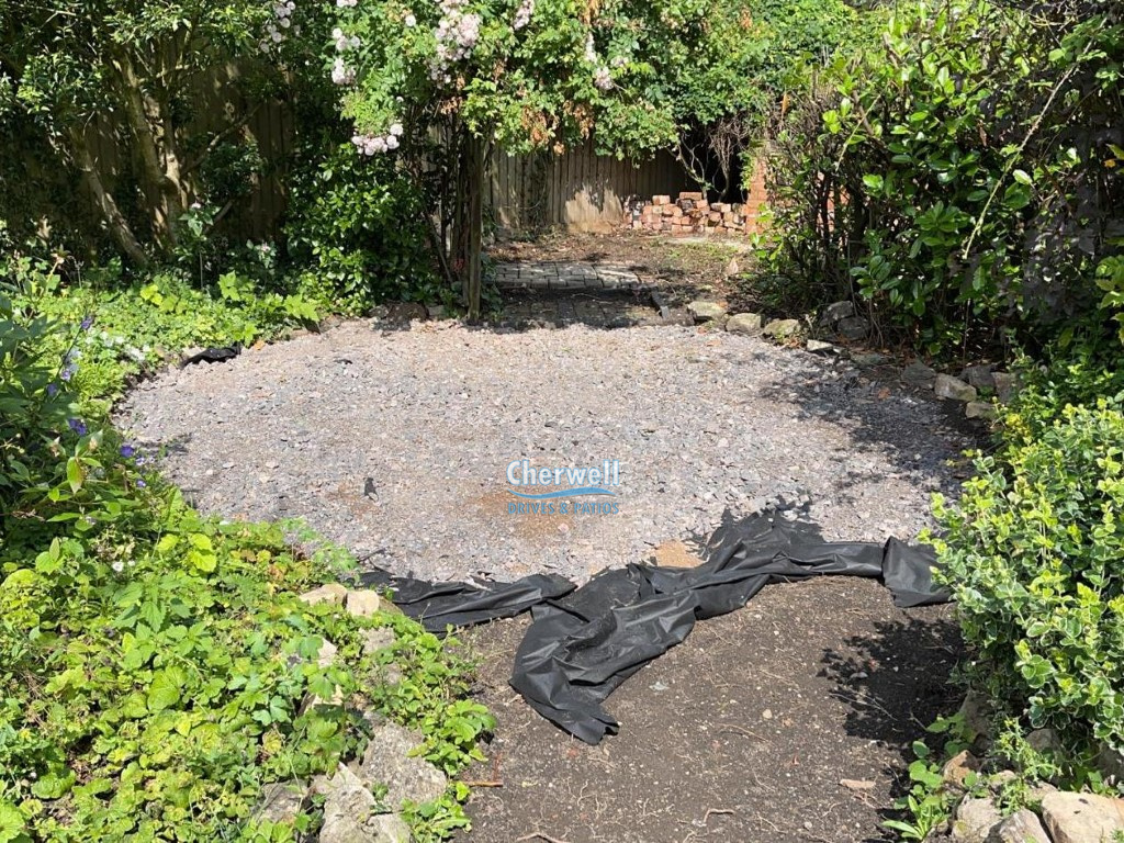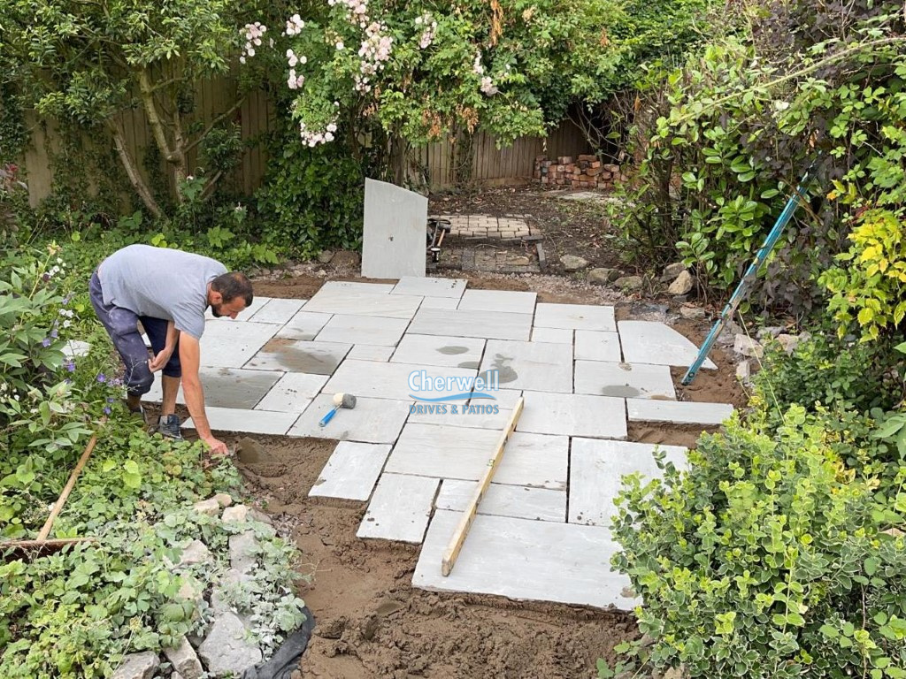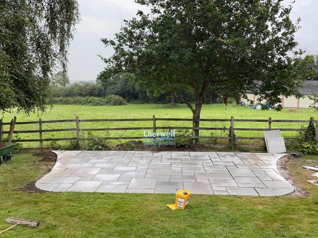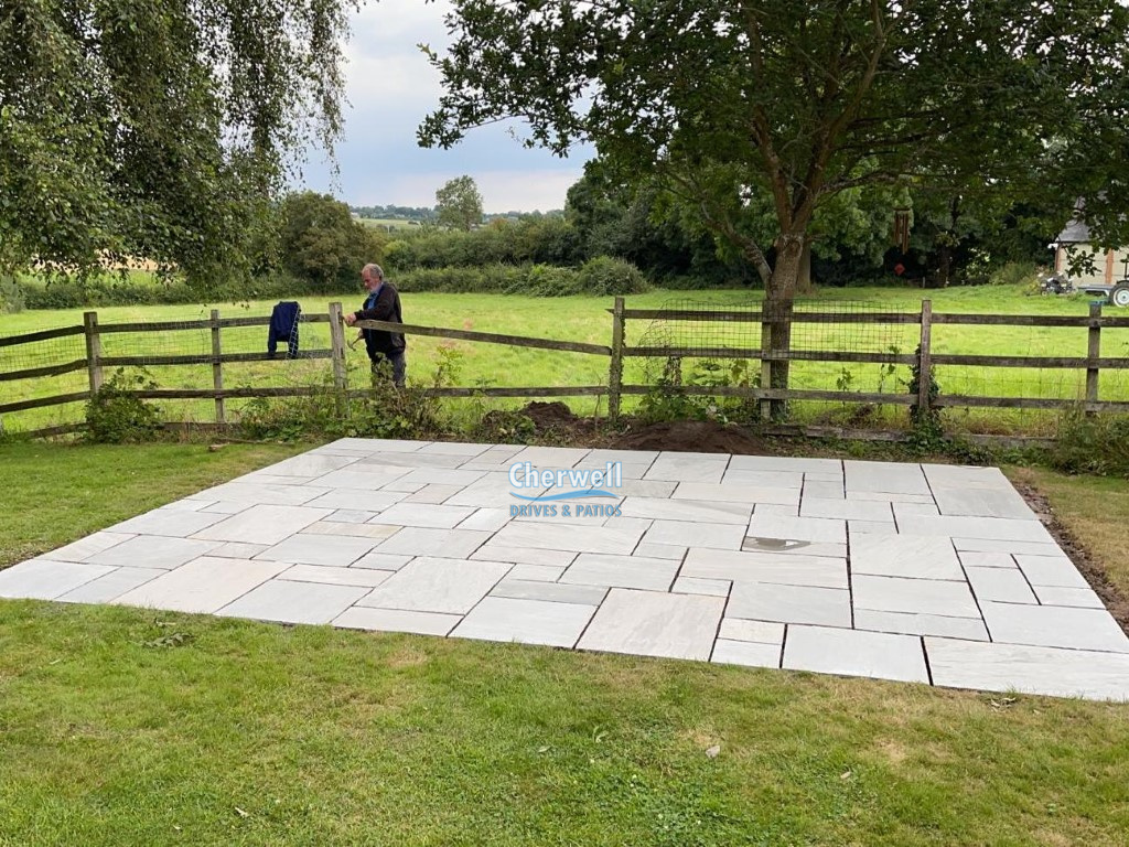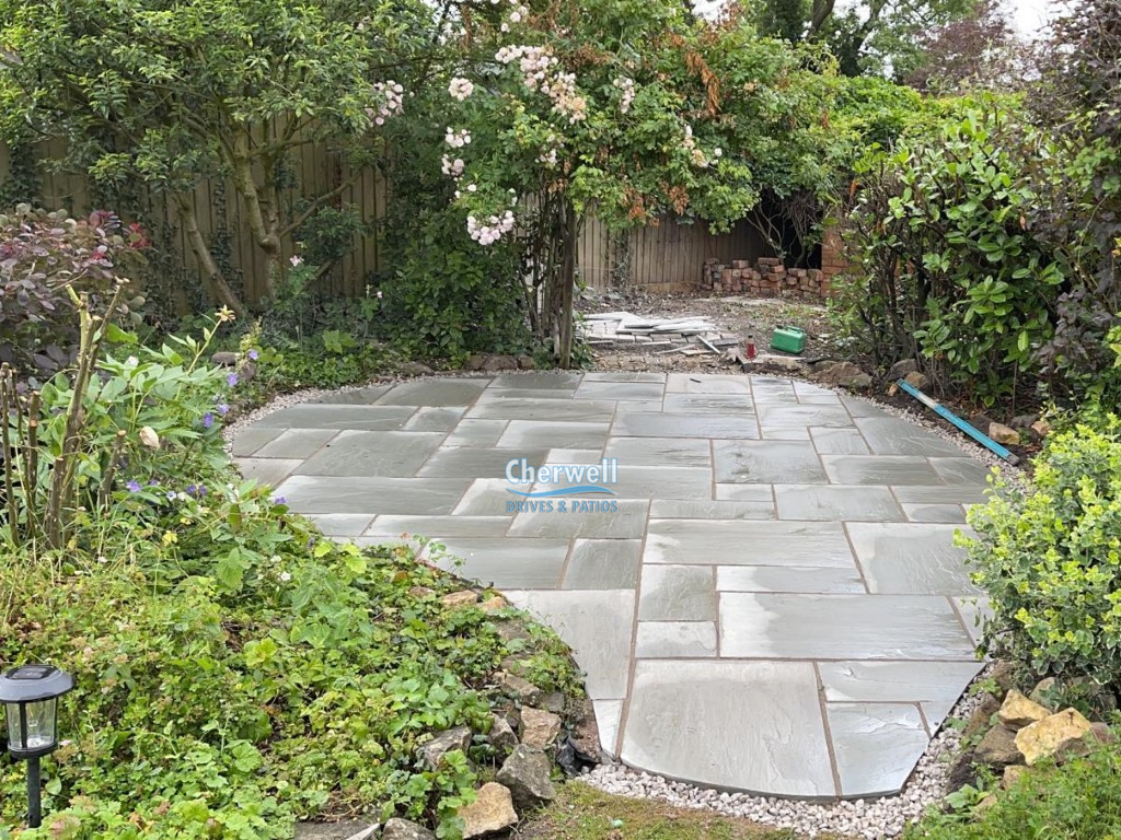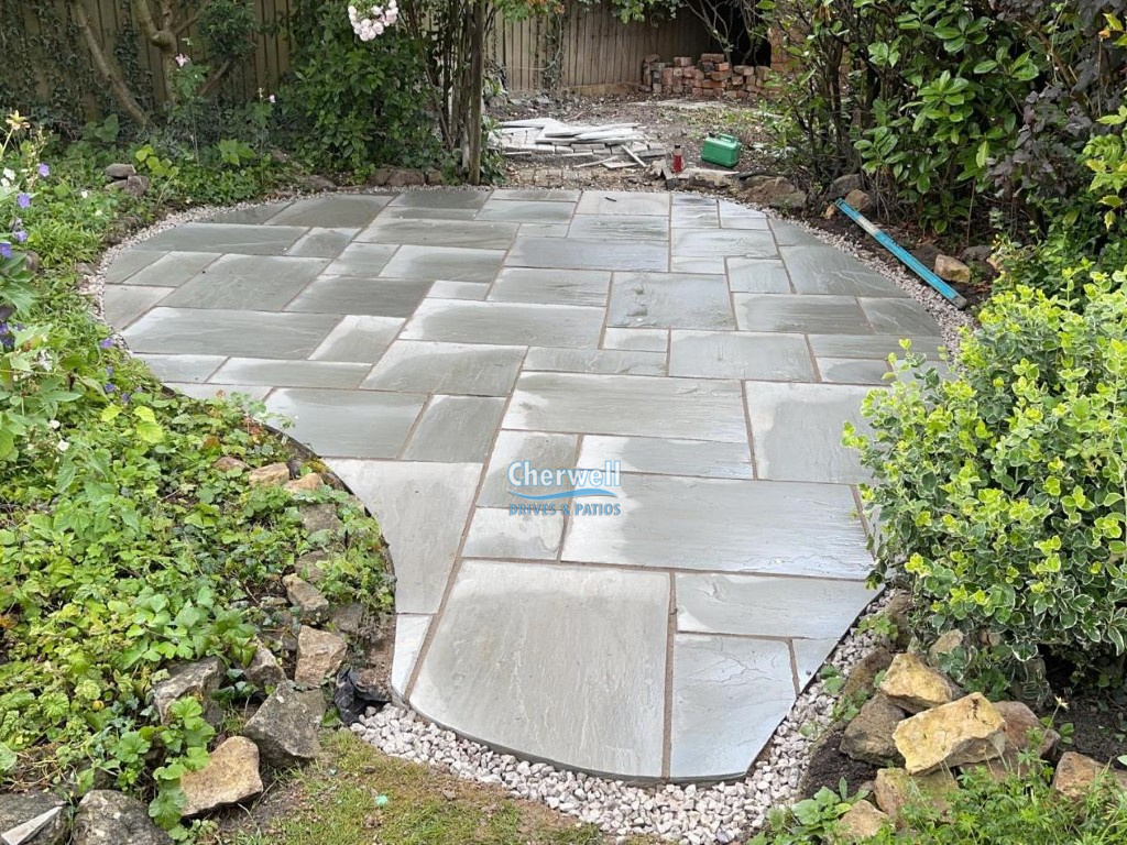 Two organically shaped patio areas with Indian sandstone slabs have been fashioned by Cherwell Drives and Patios for a client in Banbury.